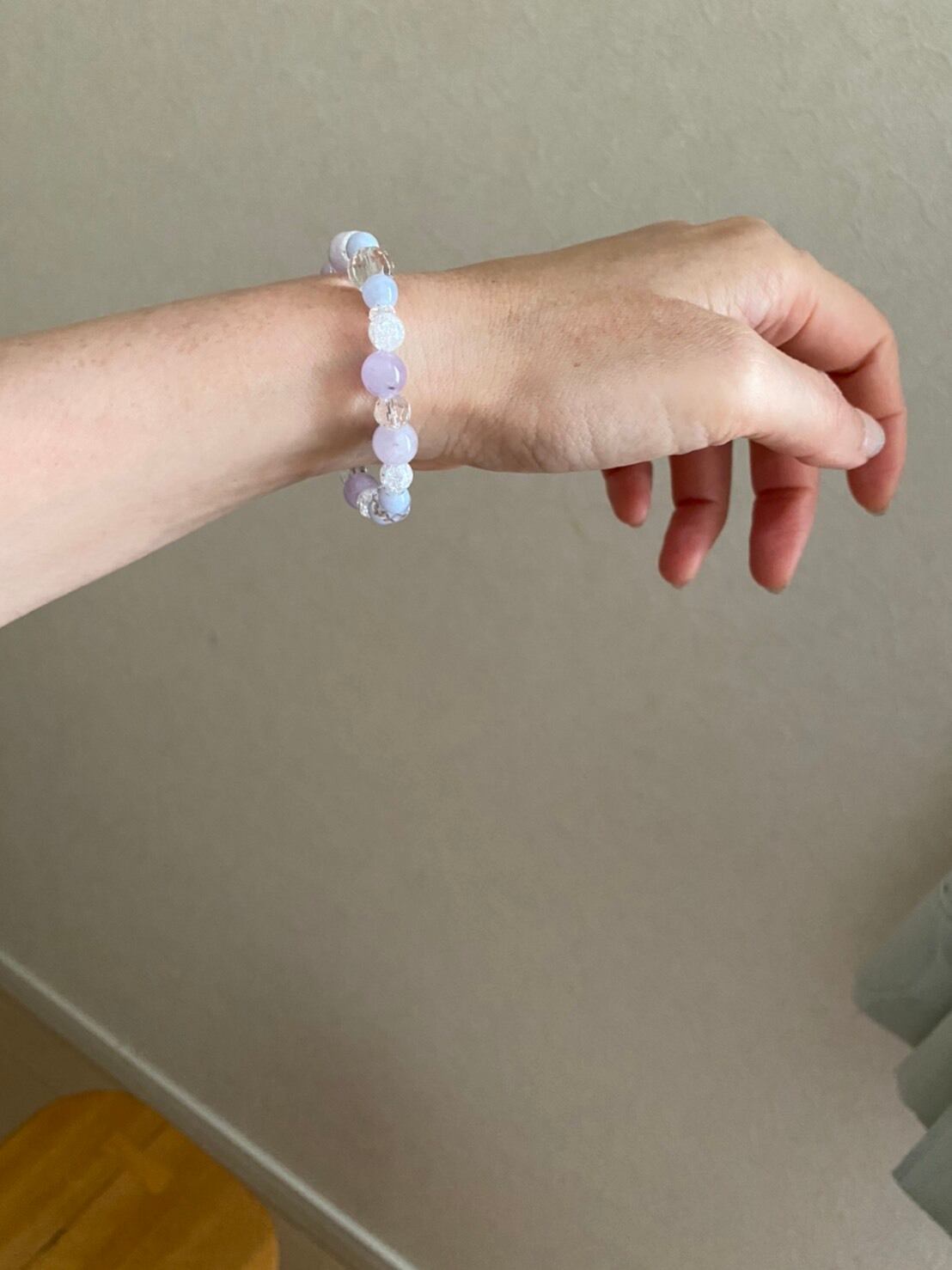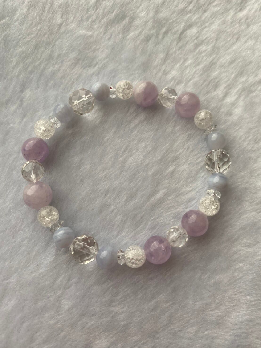 ②「ラベンダーアメシスト 8ミリ、ブルーレース6ミリ、水晶ミラーボール8ミリ、クラック水晶6ミリ、水晶ボタンビーズブレスレット」