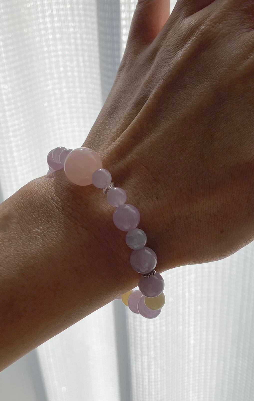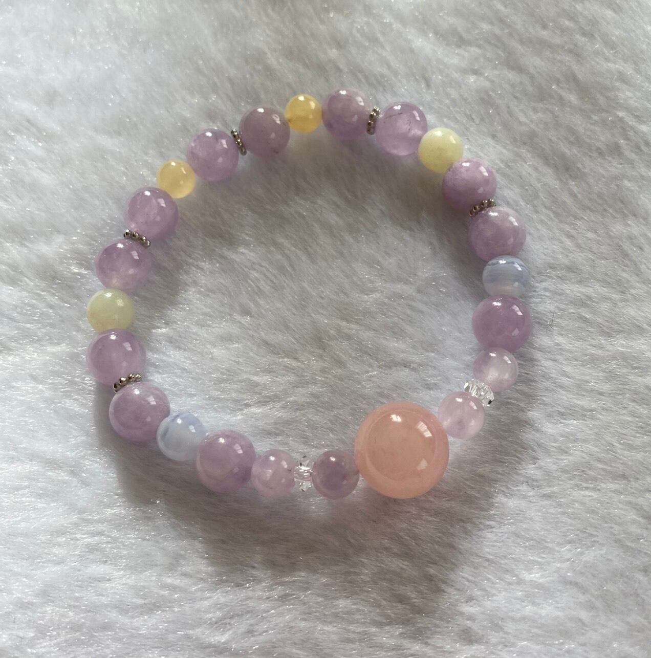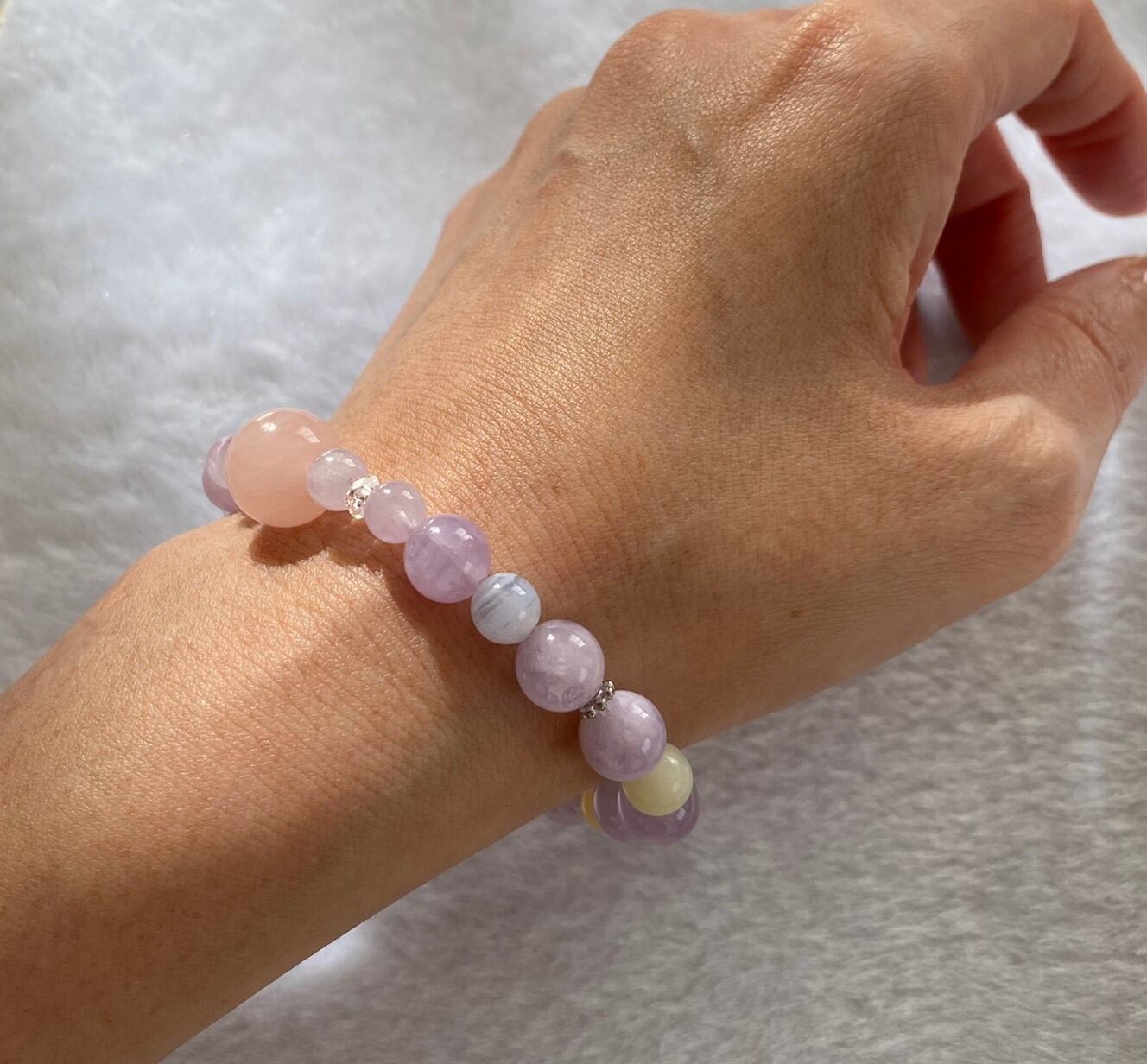 ローズクォーツ12ミリ、ラベンダーアメシスト 8ミリ、ブルーレース、ニュージェイド、アラゴナイト6ミリ、水晶ボタン、デイジーパーツブレスレット