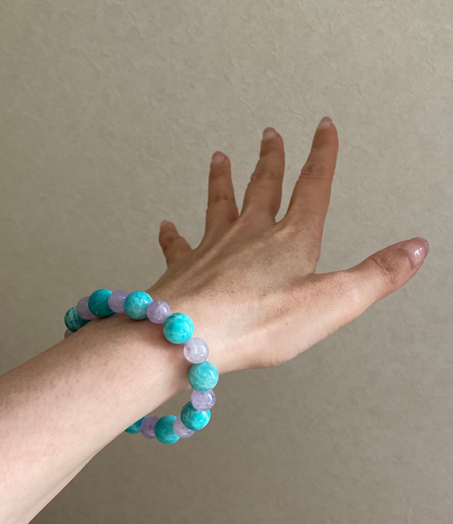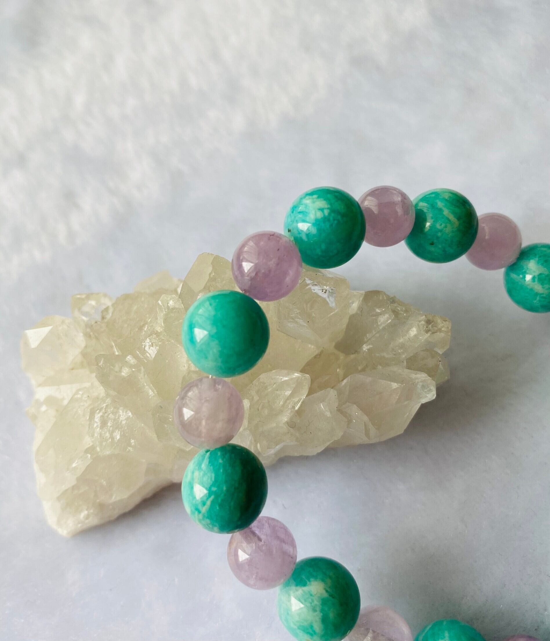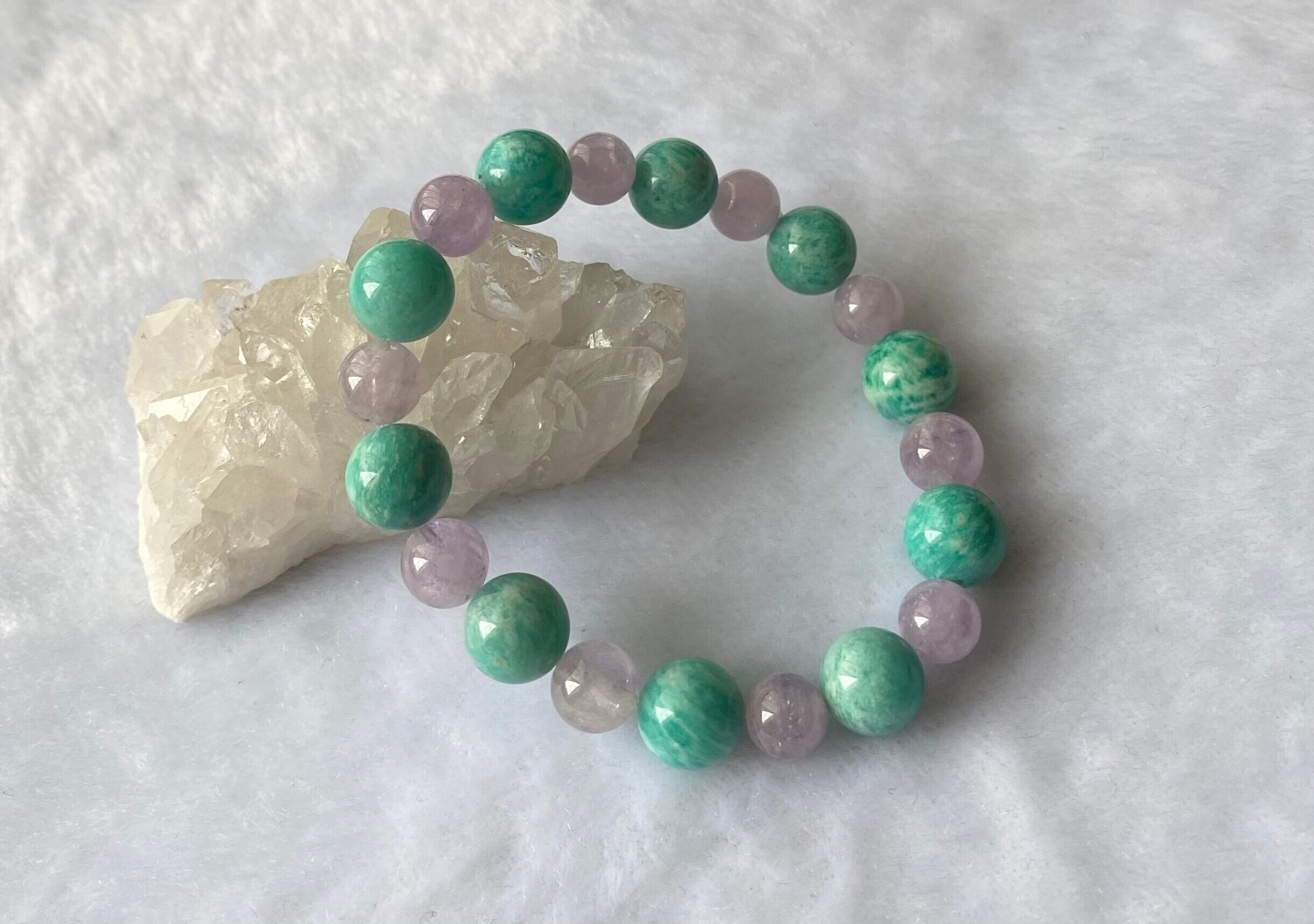 心の健康と悩み解決のサポートストーン「アマゾナイト」と、穏やかなエネルギーでありながら、見極めや決断を促すラベンダーアメシストのコンビブレスレットです。