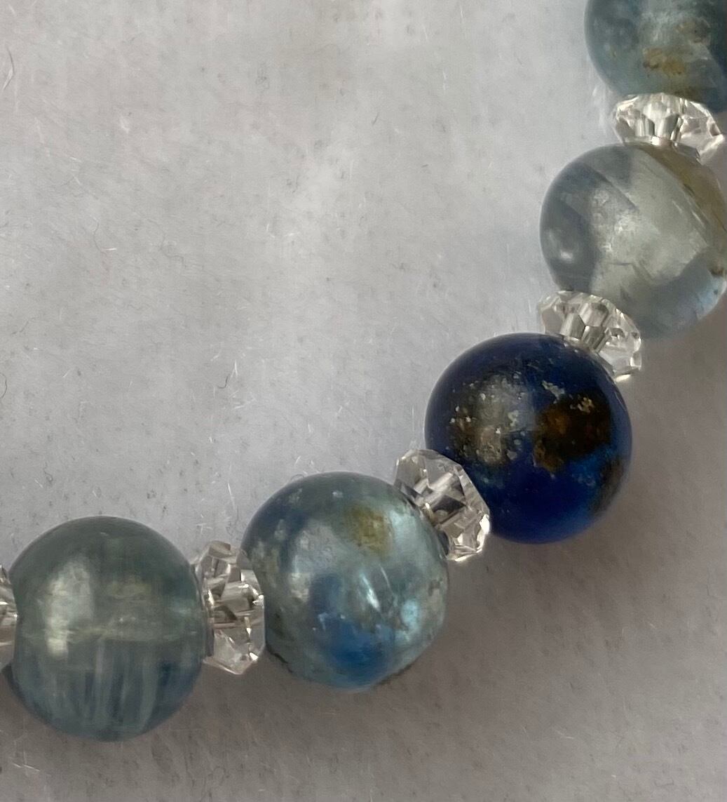 (カイヤナイトの間にキラキラ光る水晶ボタンビーズを施しました)