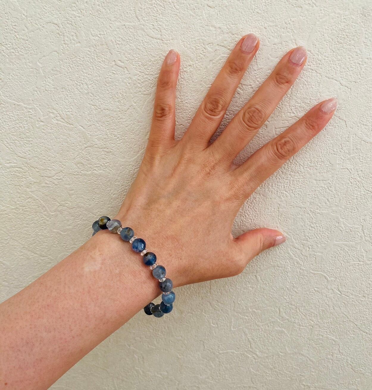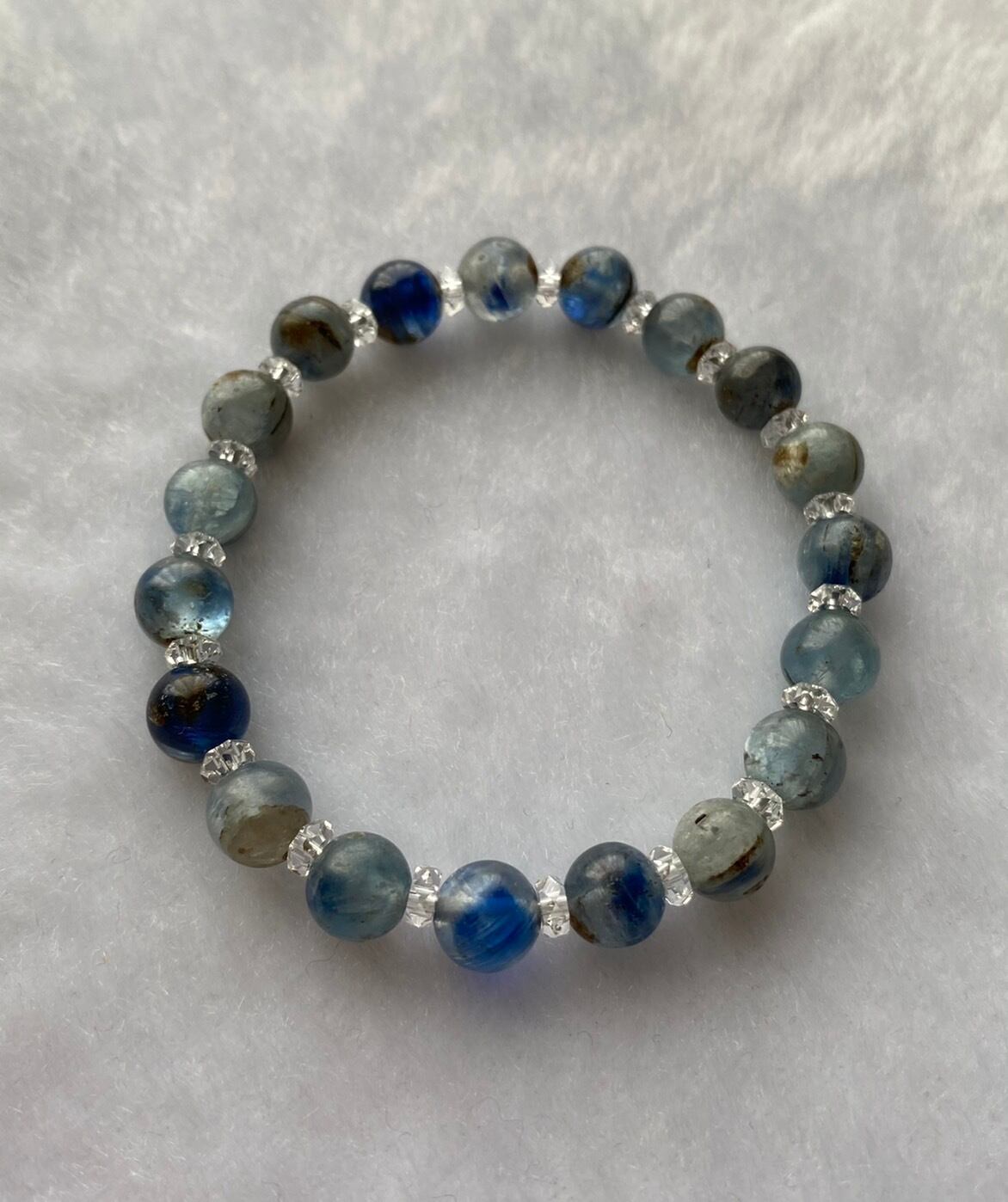 カイヤナイト8ミリビーズ水晶ボタンカットビーズブレスレット モデルの手首14.6cm