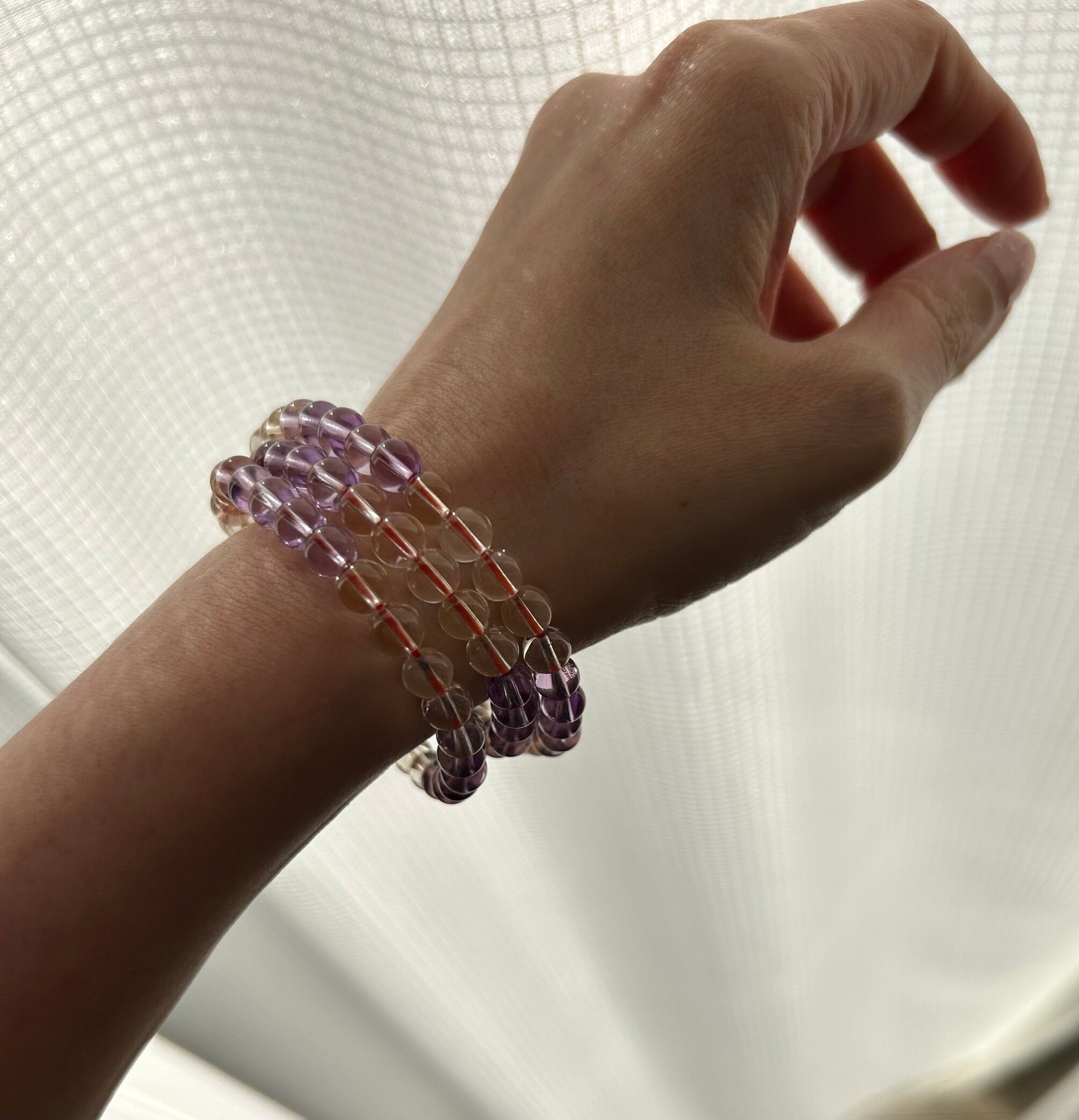透明度の高いアメシストとシトリンの3連ブレスレットは、気品あり嫌味のないゴージャス感あり、何より美しいクリアストーンにテンションが上がっちゃいます