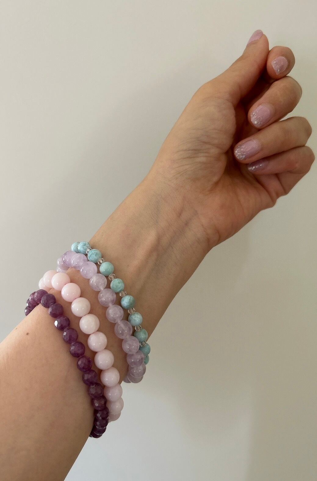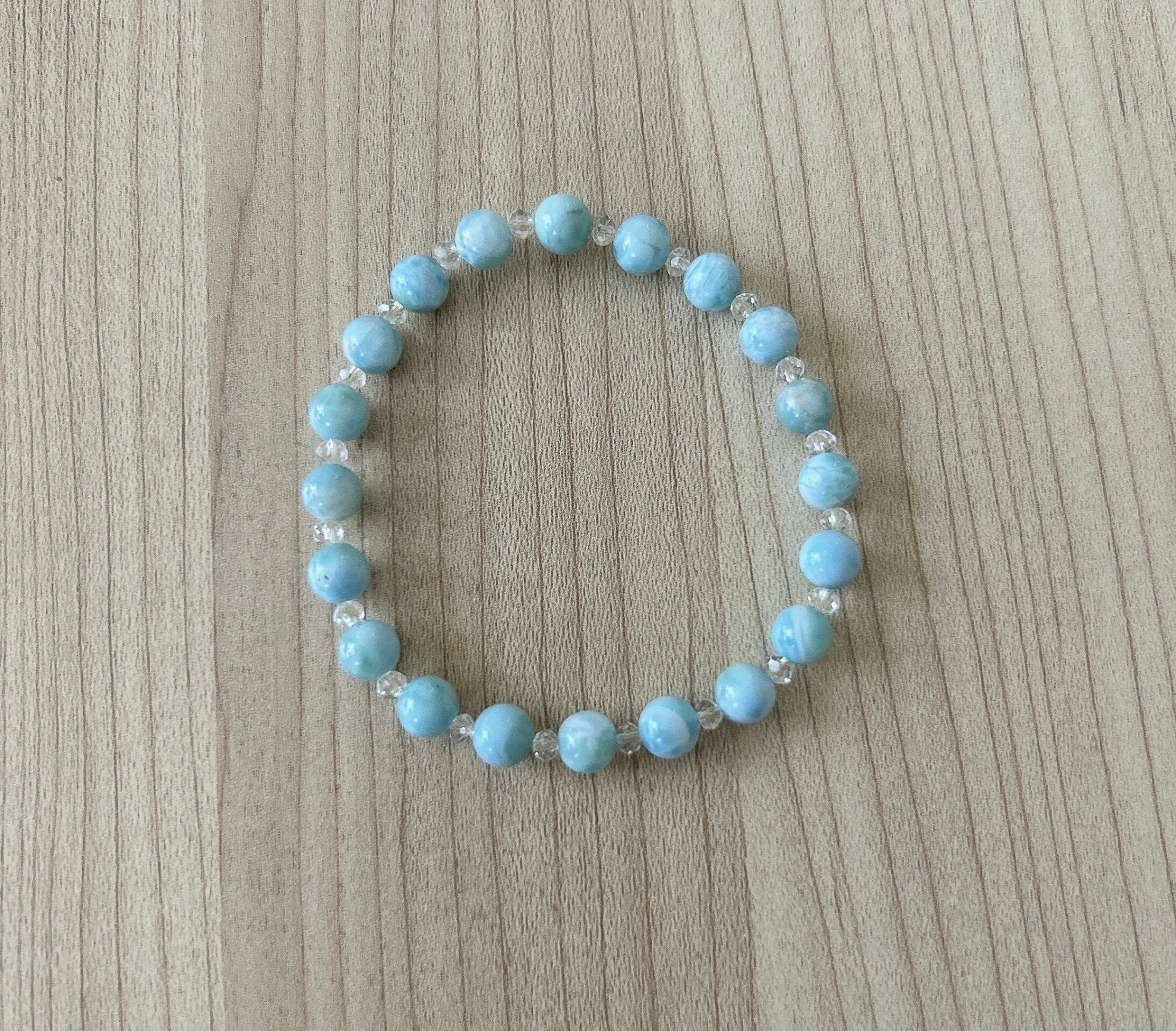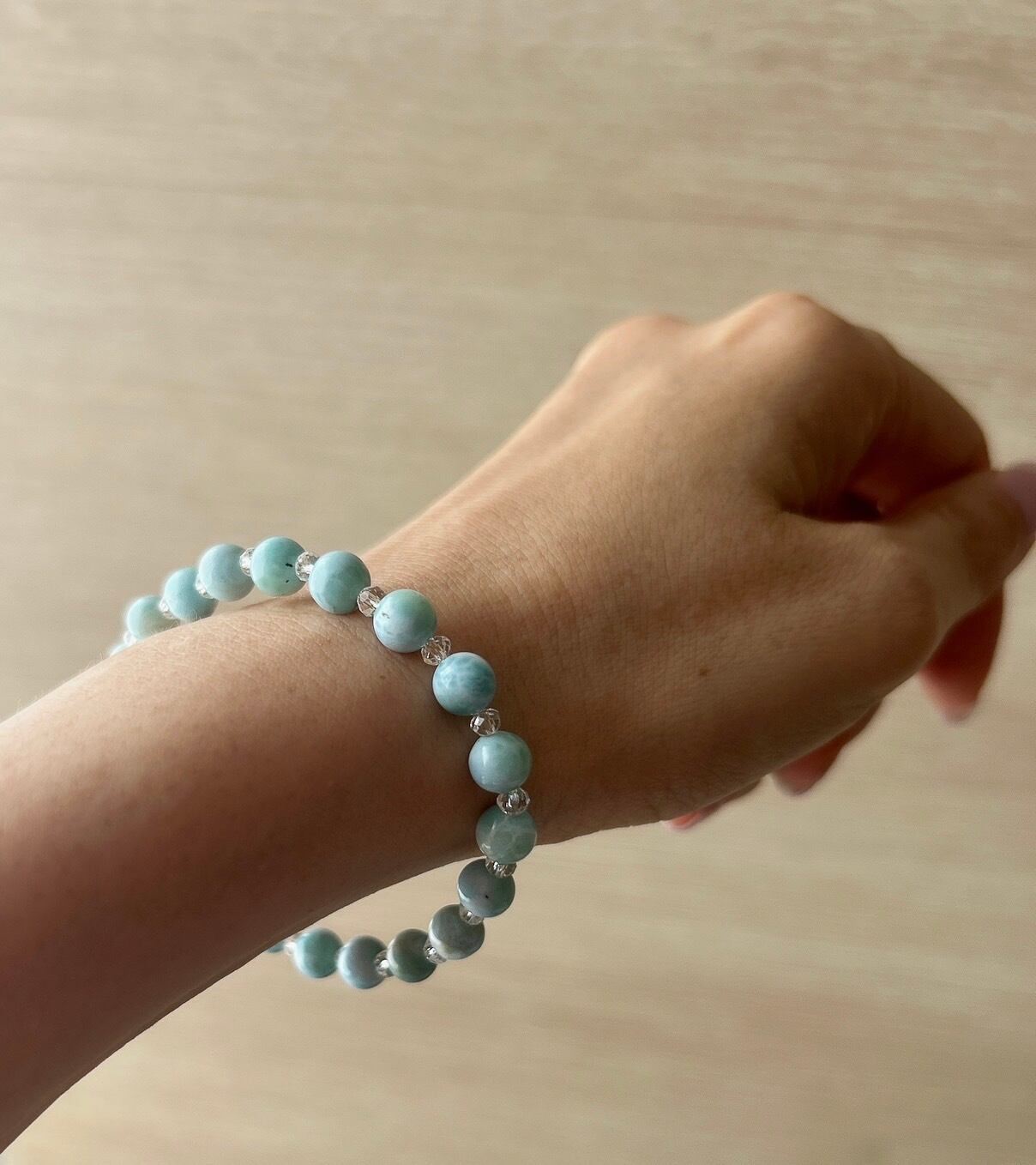 ラリマー5.5㎜ビーズ、水晶ボタンビーズコンビブレスレット @7700 モデル手首サイズ14㎝