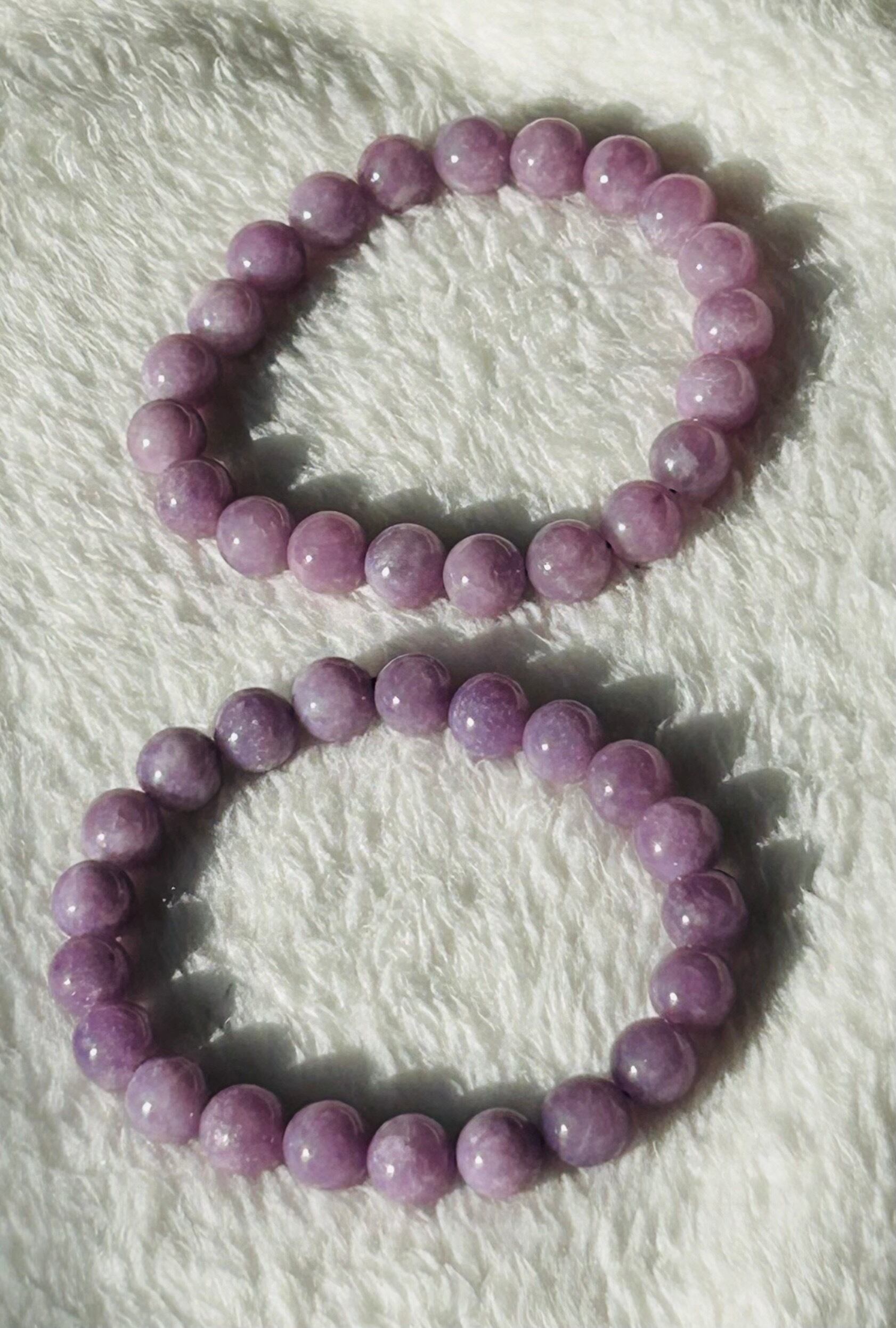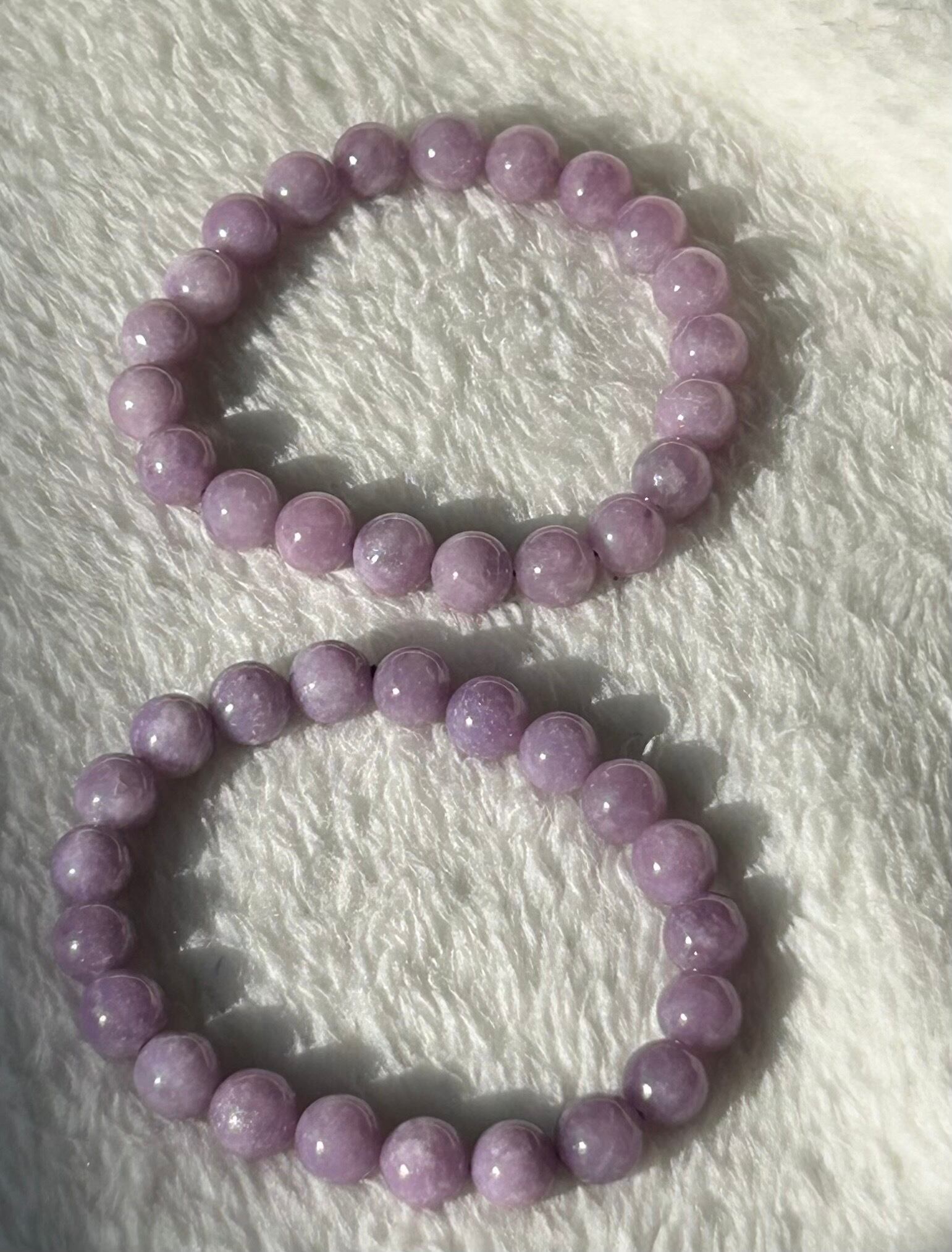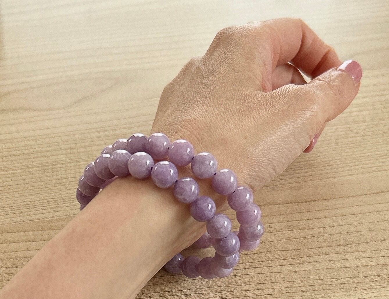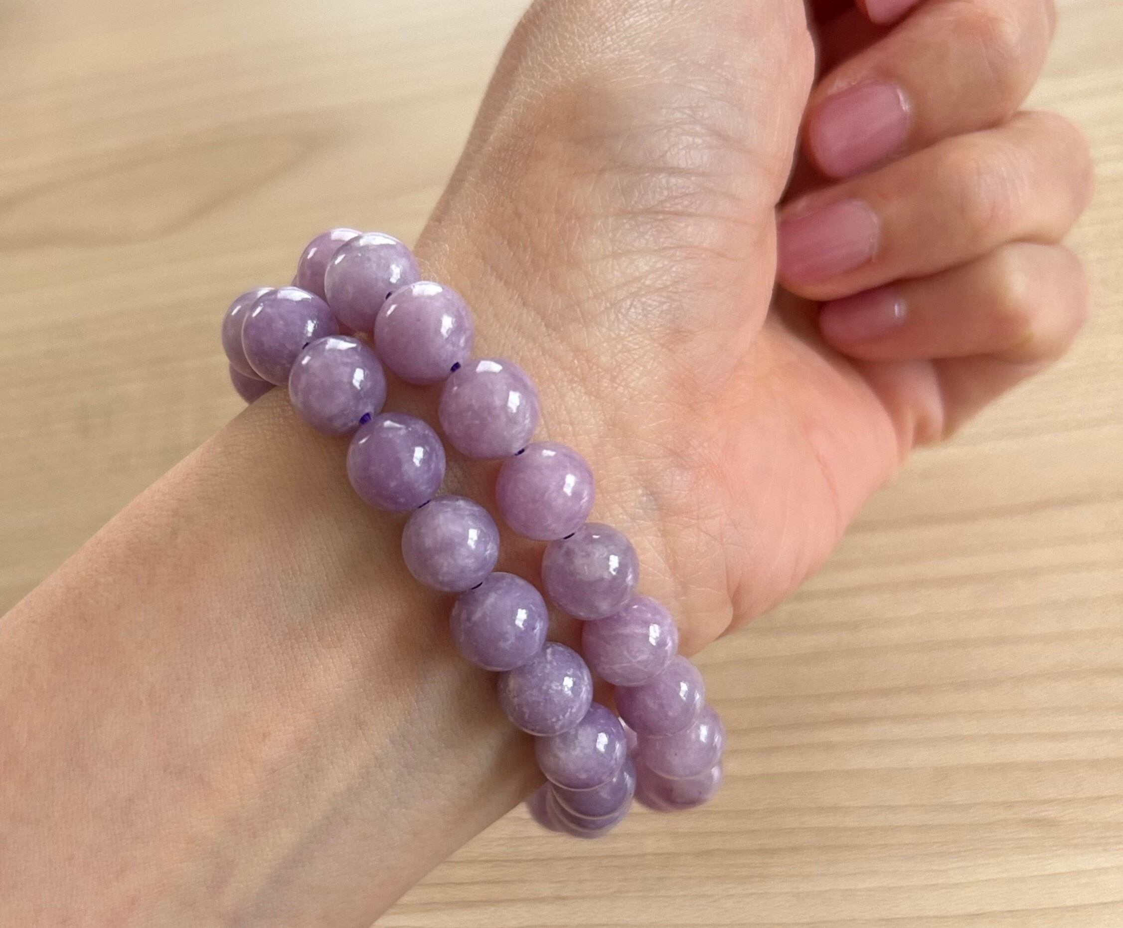 ミルキーラベンダーレピドライトシリカ9㎜ビーズブレスレット モデルの手首 14.6㎝