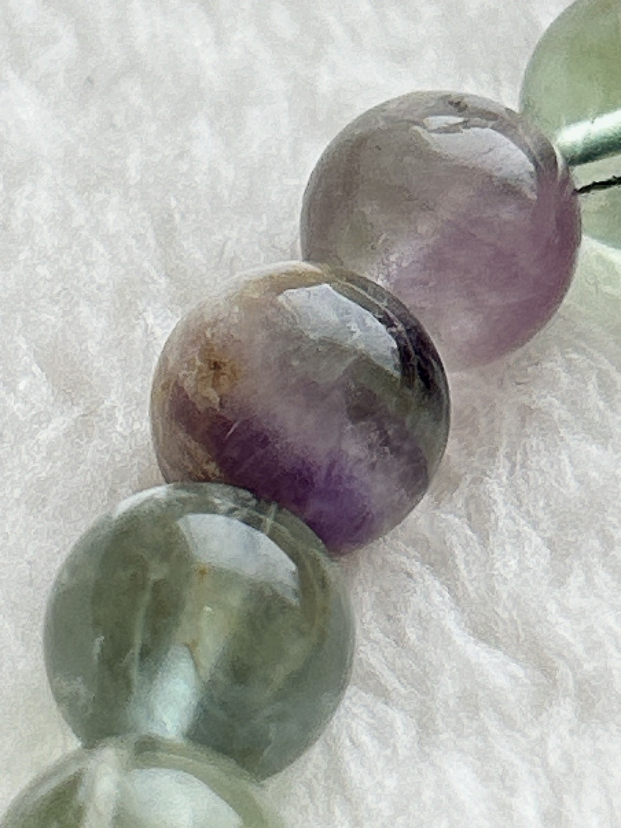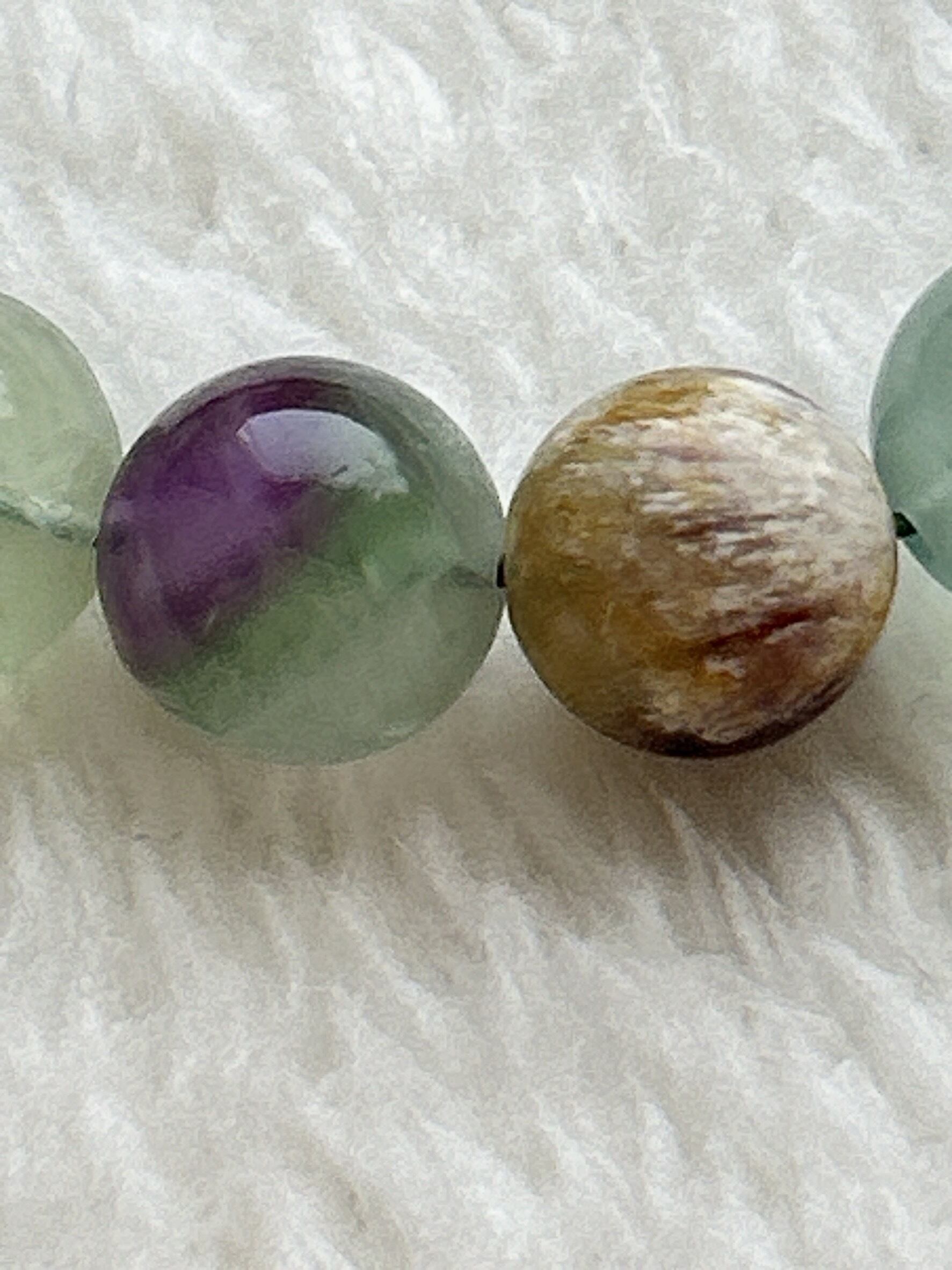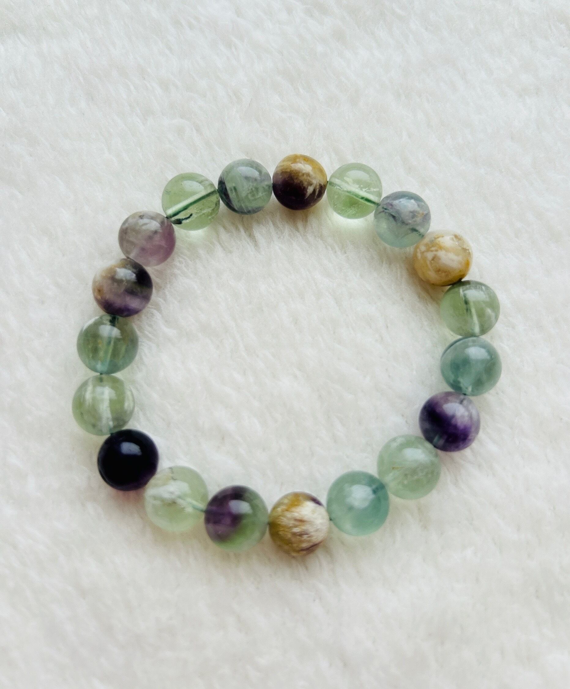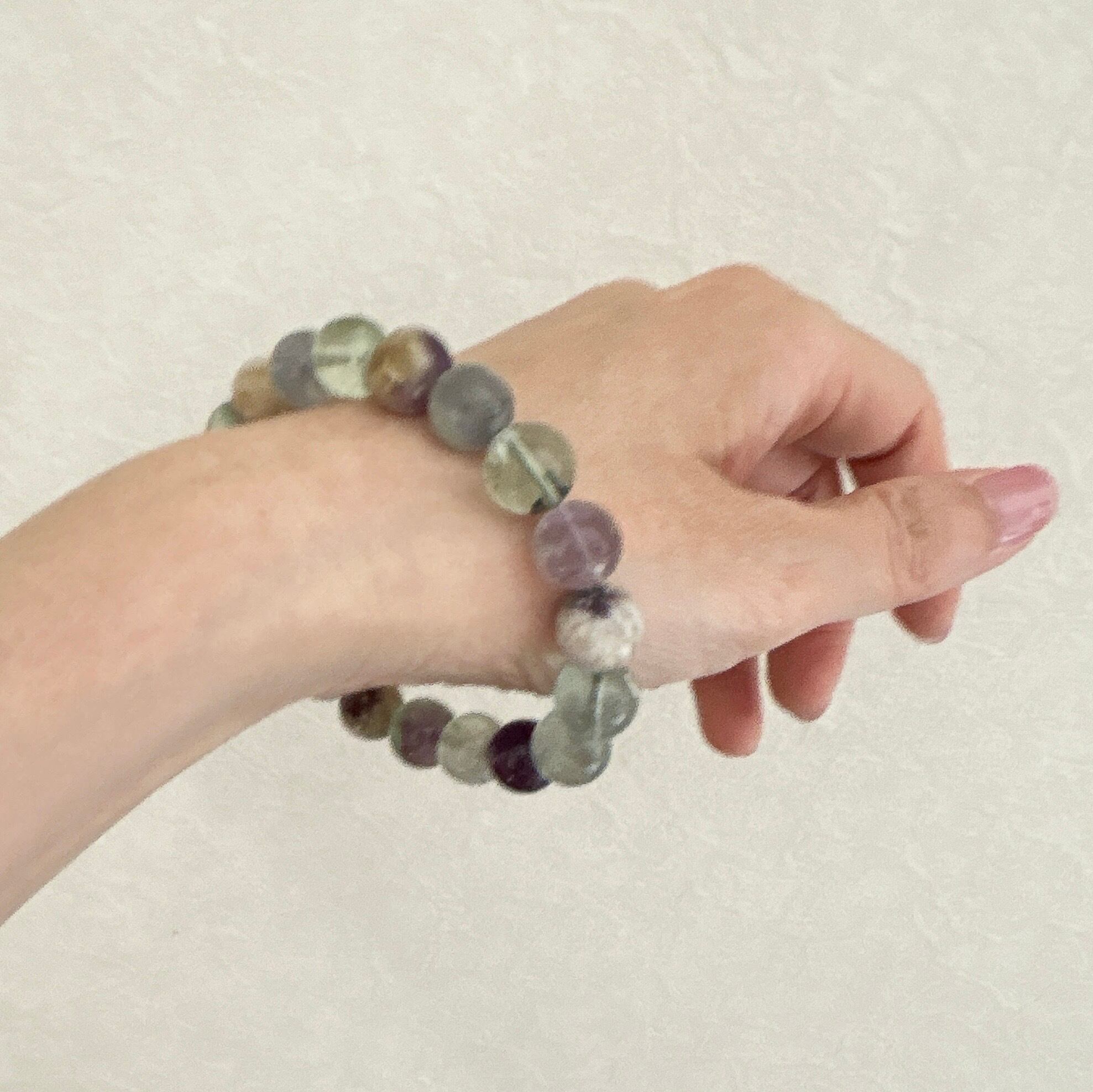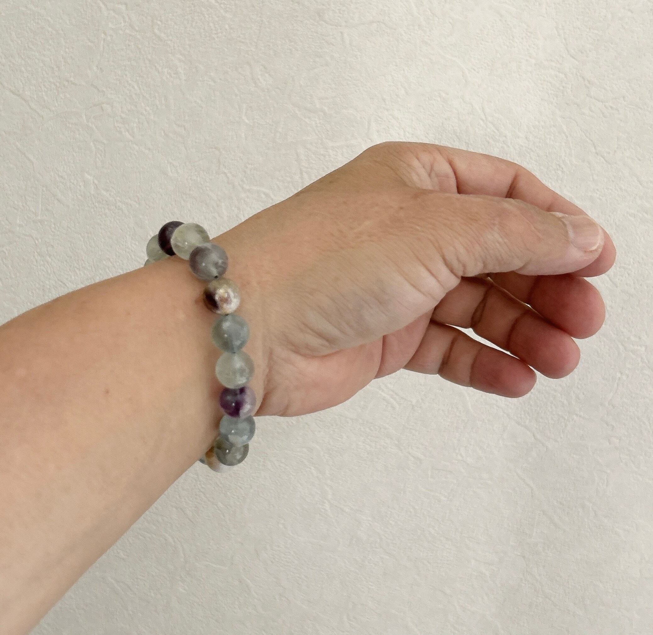 エンジェルフェザーフローライト10.5㎜ビーズブレスレット モデルの手首サイズ 14.2cm/17cm (どちらかというと男性サイズです)